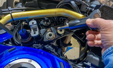 Why would you want to do this. The bike fell over on its right side in the garage. The handlebars were jacked to the right and I wasn't sure why. I took this apart to make sure the OEM risers weren't bent. It turned out that the risers were fine, just knocked off center. Loosening everything up and aligning the bike took care of most of it. Holding the front wheel and twisting the handlebars took care of the rest.